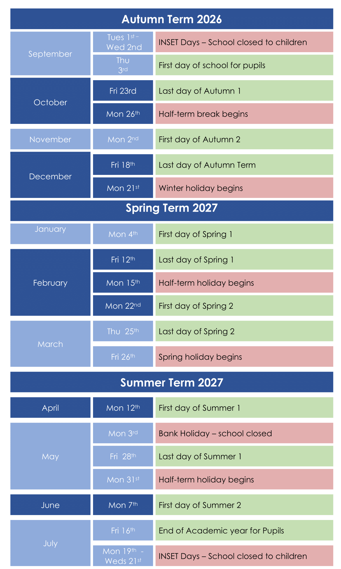 The school day begins at 8.45am for all pupils and registration is at 8.55am. At the end of the day, the school gates open at 3.10pm and children are dismissed from their classrooms at 3.15pm. The total number of hours for the week is 32.5.